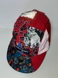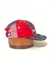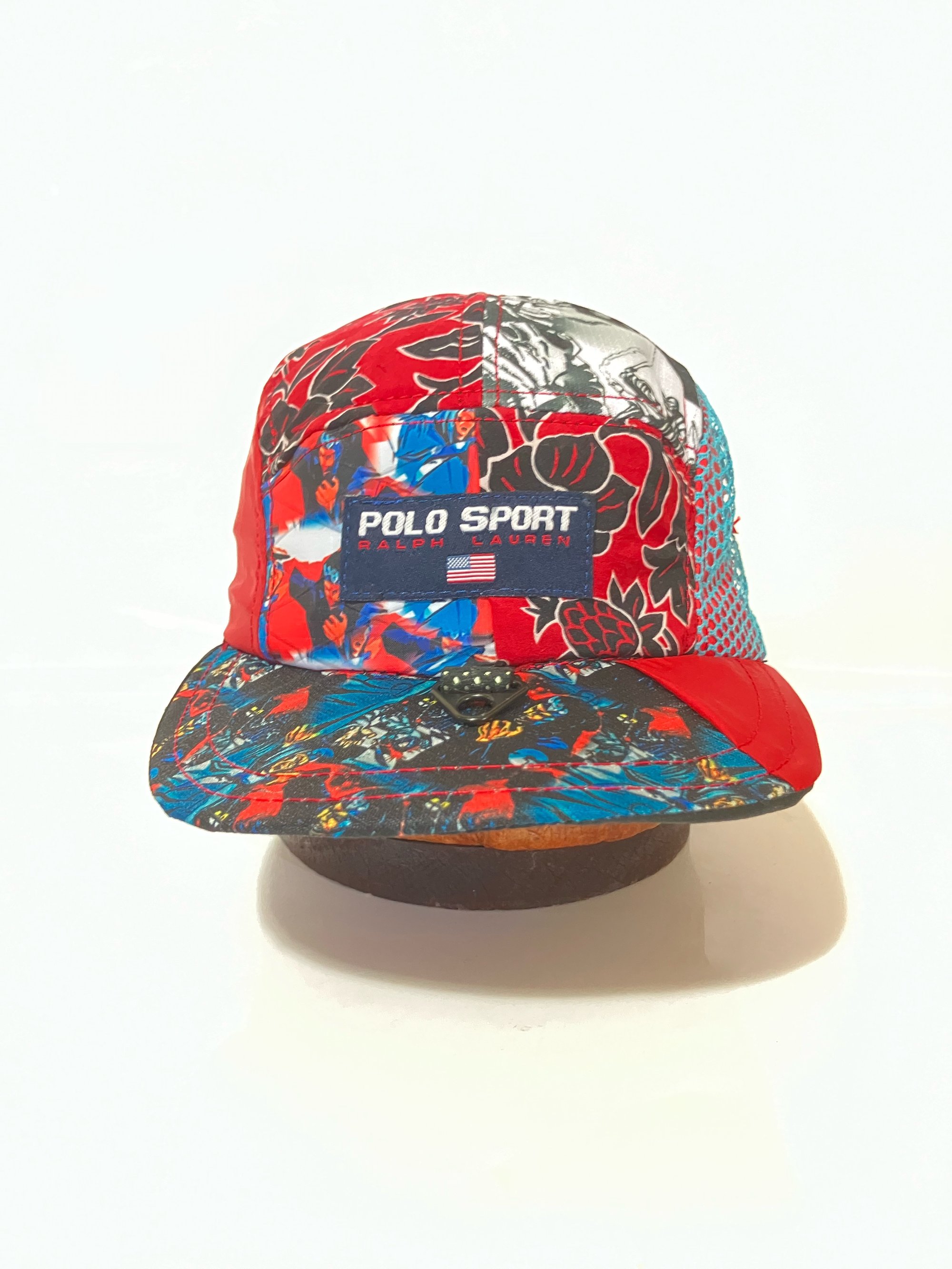 Made from polo sport nylon pants and swim trunks with sublimation dyed tech fabric scraps and reflective red fabric under blue mesh plus glowing utility loop with D ring. Terry cloth, sweatband, aluminum eyelet vents, and curvable brim, fully adjustable one size fits all, one of one, never to be replicated the same again. Standard Buckle Closure